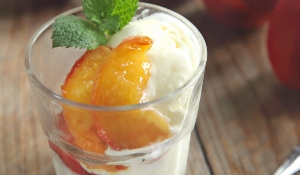 Изварата се смесва с кайсиевия конфитюр. Добавя се минералната вода на тънка струйка и се бърка до еднородна смес. Прасковите се нарязват на резени. Лимоновата кора се настъргва и се смесва с лимонов...