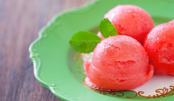 Захарта се смесва с водата и се слага на огън на умерена температура да къкри около 5 мин. Ягодите се разбиват с лимоновия сок до получаването на гладка смес, която се замразява за 3-4 часа, като се р...