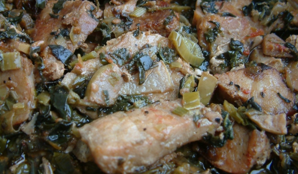 Свинското месо се нарязва на парченца и се запържва. Добавете праза, манголда, нарязаните на ситно дюли. Когато се запържат и те, се прибавя доматената салца, сол на вкус и малко вода, за да се задуш...