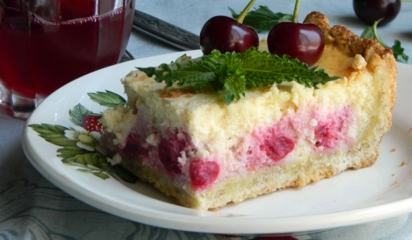 Бисквитите се натрошават и се смесват с омекналото масло. Разпределят се във форма, като се оформят стенички. Оставят се в хладилника да се стегнат. Крема сиренето се смесва с изварата и сметаната, д...