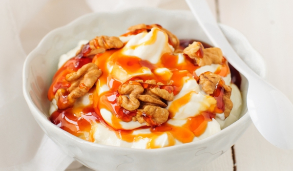 Кората на лимона се настъргва, лимонът се изстисква. Изварата се смесва с йогурта, 4 лъжици мед, кората и сока на лимона и се разбива. Разпределя се в купички. Поръсва се с орехи и се полива с мед.