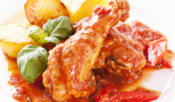 Пилешките бутчета се запържват в загрятото олио. Вадят се и на тяхно място се слагат нарязаните на едро картофи и обелените скилидки чесън. Бутчетата се връщат при зеленчуците, добавят се маслините,...