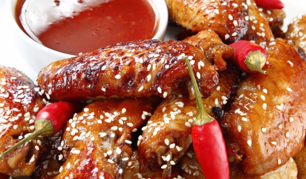 Крилцата се измиват със студена вода и се нареждат в тава. Запичат се във фурна на 240 градуса. Лютите чушки се нарязват и се запържват в зехтина. Добавят се нарязаният на ситно чесън, бульонът, заха...